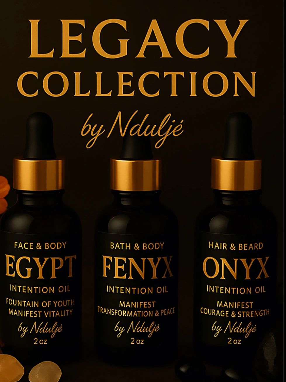 The Legacy Collection is a luxurious trio of intention-infused oils honoring beauty, energy, and feminine power. Each blend - Egypt (Vitality), Onyx (Strength), and Fenyx (Peace) is anointed with sacred botanicals, crystals, and gold accents to transform everyday self-care into divine ritual.